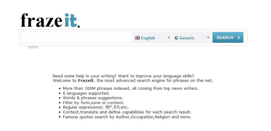إنه موقع عبارة عن محرك بحث حقيقي يساعدك على معرفة كيف يمكنك إستعمال الكلمات في الجمل ، من اجل كتابة جمل صحيحة خالية من اخطاء النحو ، موقع Fraze-It يدعم اللغة الإنجليزية ، الالمانية ، الفرنسية ، الإسبانية ، الإطالية والبرتغالية.